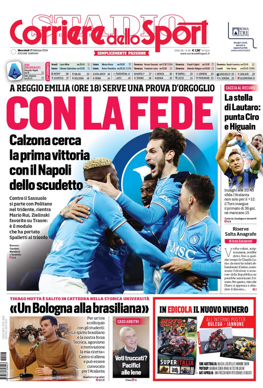 NewsCalcioIn Evidenza “RASSEGNA STAMPA”. Le prime pagine sportive del 28 febbraio By Giuseppe Sacco il Feb 28, 2024 - 07:00:24 0 Condividi In primo piano sui principali quotidiani sportivi nazionali Factory della Comunicazione CalcioNapoliRassegnaStampa 0 Condividi FacebookTwitterGoogle+ReddItWhatsAppPinterestE-mail
