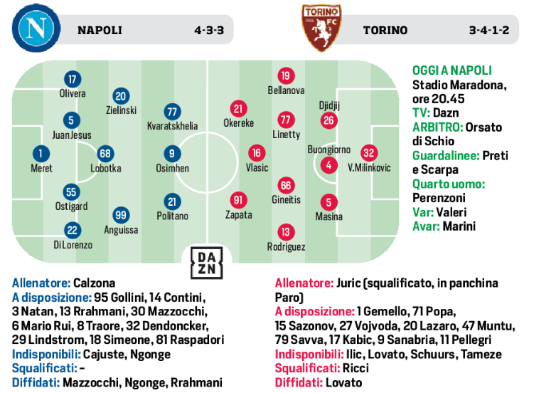 (Grafico) Napoli/Torino, il Cds mette in campo le due formazioni (20,45)