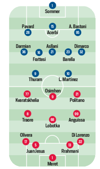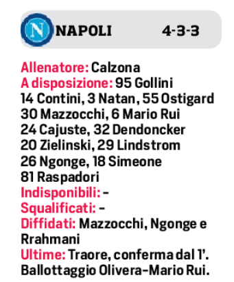 IL TURNOVER. Qualche cambio è possibile, insomma, ma tutto dipenderà da come Calzona e gli staff valuteranno la condizione della squadra e dei singoli: Olivera si candida al ritorno dal primo minuto a sinistra e incalza Mario Rui, mentre da valutare è la conferma di Traore al fianco di Anguissa e Lobotka a centrocampo: Junior è in ripresa ma è sempre reduce da un lungo periodo di inattività, tra mesi di panchine e poi la malaria. L’idea, però, è che dovrà stringere un po’ i denti e provare a smaltire le tossine in un clic. In attacco, il tridente non cambierà: Politano è il più continuo e sempre tra i più incisivi, e Osimhen e Kvaratskhelia sono gli uomini a cui Calzona non rinuncia e rinuncerà mai. Parole sue. Testuali.