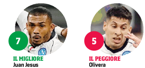 Di Lorenzo 5  – Da quel lato è un capogiro continuo: Dimarco innanzitutto, un treno; poi Bastoni (vedi 1-0) e gli inserimenti di Mkhitaryan. Nasce spesso, tutto sulla destra del Napoli. Lui, invece, riesce ad affondare appena un paio di volte in 55 minuti. In crescita nel finale come tanti colleghi.