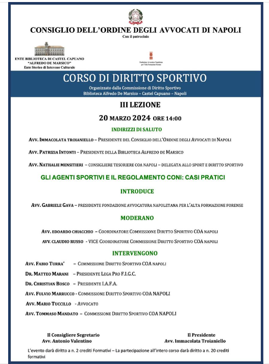 Mercoledì 20 Marzo 2024 ore 14.00, sarò fra i relatori nella terza lezione del Corso di Diritto Sportivo organizzato dalla Commissione di Diritto Sportivo, della quale sono orgoglioso di farne parte, con un incontro particolarmente interessante dal titolo: GLI AGENTI SPORTIVI E IL REGOLAMENTO CONI: CASI PRATICI.