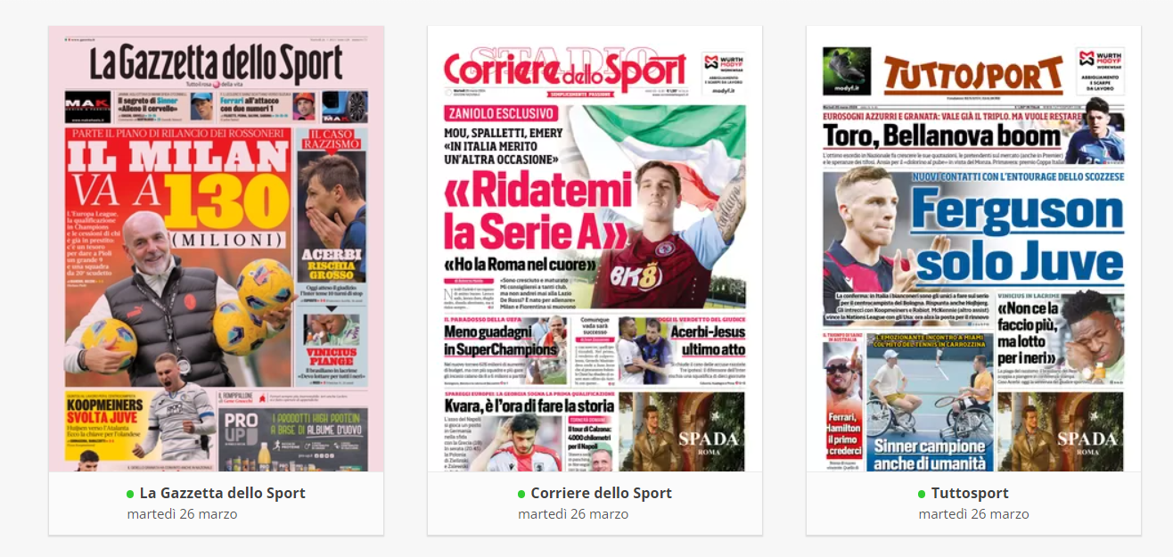 NewsCalcioIn Evidenza “LA RASSEGNA STAMPA” – Prime pagine sportive del 26 marzo By Giuseppe Sacco il Mar 26, 2024 - 07:00:13 0 Condividi In primo piano sui principali quotidiani sportivi nazionali Factory della Comunicazione CalcioNapoliRassegnaStampa 0 Condividi FacebookTwitterGoogle+ReddItWhatsAppPinterestE-mail