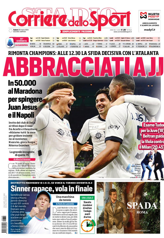 E’ una giornata speciale, piena di risvolti mica solo calcistici, contiene in sé anche gli effetti dolenti di due settimane maleodoranti, con i graffi striscianti che Juan Jesus ha avvertito sulla propria pelle e che la sentenza del giudice sportivo ha adagiato tra i libri (sacri?) dell’ordinamento giuridico-sportivo: è un capitolo amarissimo, un’eco fastidiosa, il sintomo di un malessere che Napoli affronterà frontalmente, in un sabato santo in cui le coscienze verranno indotte a riflettere anche da video che il megaschermo diffonderà per combattere una battata sacra senza mettersi la mano sulla bocca. «Crediamo in un mondo dove l’uguaglianza e il rispetto non siano soltanto una vana illusione ma principi concreti e universalmente riconosciuti. Affinché ciò avvenga non dobbiamo rimanere in silenzio. Questa è l’occasione giusta per alzare la nostra voce e dire tutti assieme No al razzismo».
