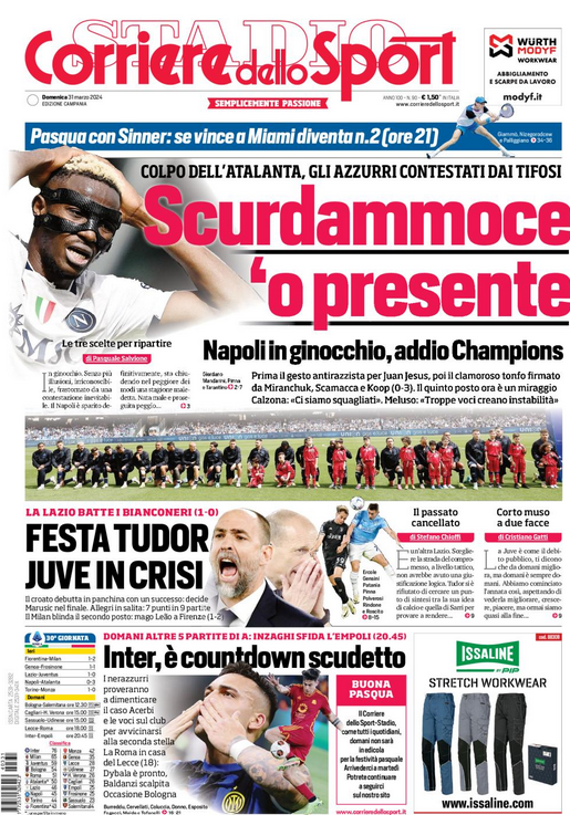 “SCURDAMMOCE ‘O PRESENTE”. CdS Campania:” Napoli in ginocchio, addio Champions”