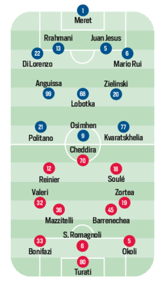 Juan Jesus ha recuperato a tempo di record. Dopo aver trascorso in palestra la seduta di mercoledì per un fastidio fisico, ieri il difensore brasiliano s’è regolarmente allenato al centro sportivo di Castel Volturno insieme con il resto del gruppo. A questo punto la sua presenza non è più in dubbio per la partita in programma domenica alle 12.30 al Maradona contro il Frosinone, anche se poi toccherà a Calzona decidere se schierarlo dal 1’. Anche Politano, come JJ soltanto in palestra un paio di gorni fa, sarà regolarmente della sfida: ha svolto una parte di allenamento in gruppo e una parte di personalizzato in campo. L’unico assente certificato, insomma, resta Olivera: fermo per la lesione di basso grado al muscolo adduttore lungo della coscia destra, il terzino è stato sottoposto anche ieri al ciclo di terapie previsto dalla tabella riabilitativa. Per il resto, la squadra ha iniziato la sessione con attivazione e circuito atletico; chiusura con lavoro tecnico-tattico e partitina a campo ridotto. Per quel che riguarda la formazione, in porta ci sarà Meret; la linea a quattro sarà composta da Di Lorenzo, Rrahmani, uno tra Jesus e Ostigard e Mario Rui; a centrocampo Anguissa, Lobotka e Zielinski; tridente Politano, Osimhen, Kvaratskhelia. Ngonge è squalificato.