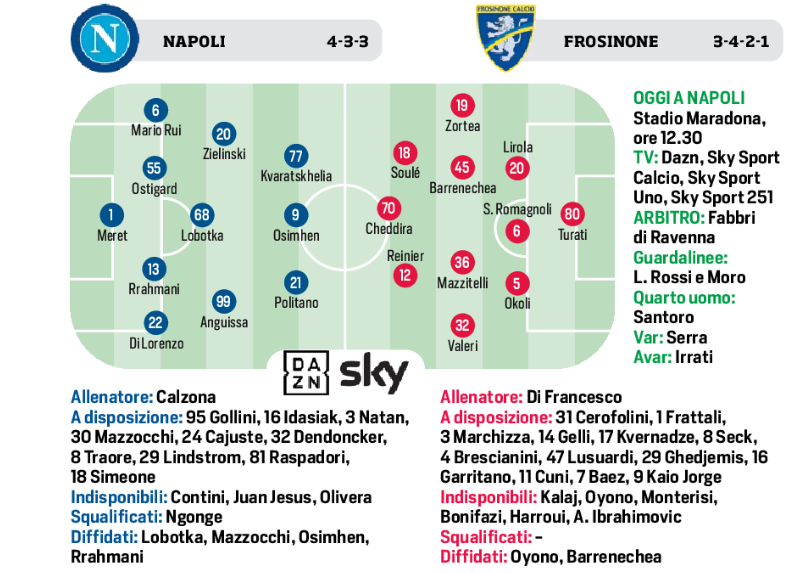 La sintonia non è certo da ritrovare. Si conoscono, eccome se si conoscono. Come per gli altri titolari di oggi: tutti campioni d’Italia. Da Meret in porta a capitan Di Lorenzo e Mario Rui, compagni di reparto. Olivera s’era infortunato una settimana fa e ieri ha fatto differenziato. La fascia sinistra, non ci sono dubbi, sarà del portoghese. Il centrocampo è quello di Monza: Lobotka, Anguissa e soprattutto Zielinski, ancora titolare dopo la perla di domenica scorsa. Il centrocampista polacco ha dimostrato attaccamento e professionalità, impossibile metterlo da parte nel rush finale, nonostante sia già promesso sposo dell’Inter. E in avanti, Politano stavolta partirà dal 1’, a differenza di una settimana fa, quando entrò nella ripresa e segnò una delle più belle, se non la più bella rete della sua carriera sotto gli occhi della figlia, Giselle. Ha avuto qualche problemino fisico, ma il suo impiego non è in dubbio già da metà settimana. Ngonge è squalificato, ma visto quanto fatto a Monza, sarebbe stato comunque difficile mettere in dubbio la sua titolarità. Politano giocherà a destra nel tridente con Kvaratskhelia e Osimhen. Il nigeriano è diffidato, così come Lobotka, Rrahmani e Mazzocchi. In caso di giallo, salteranno la trasferta di Empoli. Calzona non se lo augura: per le ultime 7, c’è bisogno di tutti i ‘campioni’.