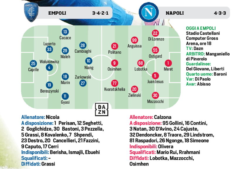 (Grafico) Empoli/Napoli il CorrSport mette in campo le possibili formazioni