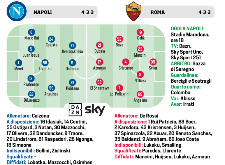 Nel ritiro di Castel Volturno il Napoli s’è allenato, ha studiato la Roma e ha ipotizzato le mosse tattiche che De Rossi oggi proverà a mettere in campo al Maradona. Titolarissimi, ancora una volta, ma con una defezione importante. Zielinski s’è infortunato e oggi alle 18 non ci sarà nella sfida ai giallorossi. Il centrocampista polacco, rispolverato da Calzona nelle ultime tre partite in cui ha giocato dal 1’, ha riportato una lesione di basso grado al gastrocnemio mediale della gamba sinistra. Un infortunio non grave, ma da rivalutare all’inizio della prossima settimana per capire se potrà recuperare in tempo per la partita del 6 maggio a Udine, lì dove più o meno un anno fa il Napoli festeggiava la vittoria del 3° scudetto. Più probabile, però, che i tempi di recupero siano di una quindicina di giorni. Per il suo posto, il ballottaggio è tra Cajuste e Traore. Lo svedese, favorito, ha giocato qualche spezzone di partita (22’ contro il Monza, 12’ contro il Frosinone), ma ha solo 6 presenze da titolare quest’anno in campionato. L’ivoriano, invece, è scomparso dai radar dalla gara contro l’Atalanta, quando fu sostituito all’intervallo.