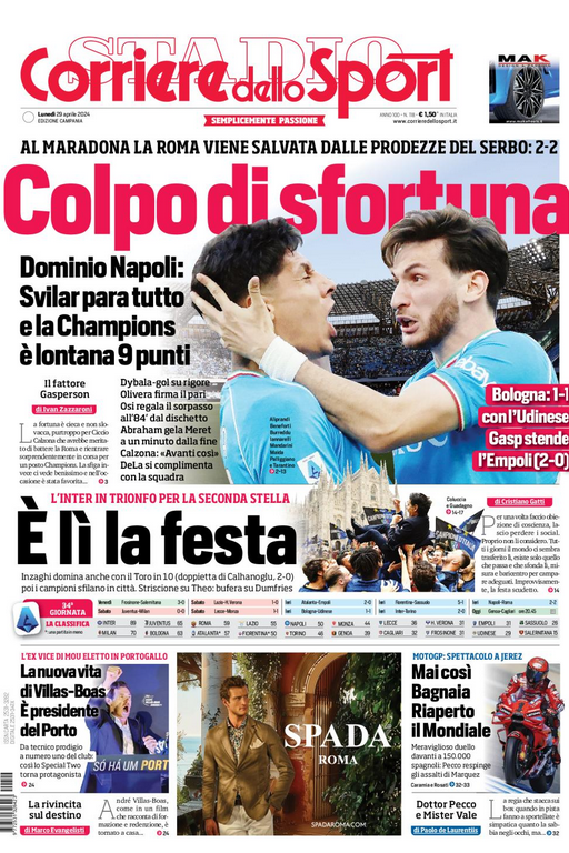 LA FOLLIA. Ma siccome il calcio non è una scienza esatta, a portarsi avanti con il lavoro è stata la Roma, che ha approfittato di un momento di break concesso dall’avversario nella ripresa. Il rigore molto casuale, trasformato da Dybala alla prima “mascherata” nel tempio di Diego, è stato generato da un intervento maldestro dell’ex Juan Jesus su Azmoun, invisibile per lunghi tratti quanto scaltro nella circostanza. E qui De Rossi, consapevole di una grazia piovuta chissà come, ha ritenuto giusto coprirsi, con Angeliño al posto di El Shaarawy e una squadra molto vicina al 5-3-2. Non ha funzionato però. Specialmente per merito del Napoli che ha continuato a martellare senza tregua da ogni fronte. Eppure Svilar, il migliore per distacco nella partita, forse non si sarebbe mai inchinato se non fosse stato impallinato dal fuoco amico. Prima una sciocca palla persa da Mancini, in evidente difficoltà fisica, ha consentito a Olivera di mirare su Kristensen, che ha alzato la parabola letale. Poi l’incomprensibile entrata di Renato Sanches (De Rossi, perché riproporlo?) su Kvara che il Var ha segnalato a Sozza ha regalato il rigore del 2-1 a Osimhen. Finita? Sembrava, ma con la Roma sui calci d’angolo devi sempre stare in guardia. Calzona ha riempito l’area aggiungendo Ostigard proprio prima del cross di Dybala ottenendo l’effetto di disorientare il Napoli. Abraham, subentrato ad Azmoun, ha attaccato la linea del fuorigioco, sfruttato la torre di N’Dicka e segnato di testa dopo un anno esatto di attesa. L’uomo più felice nel caos è proprio lui. Fonte: Cds