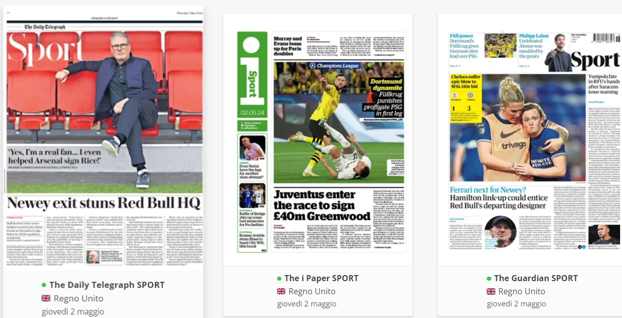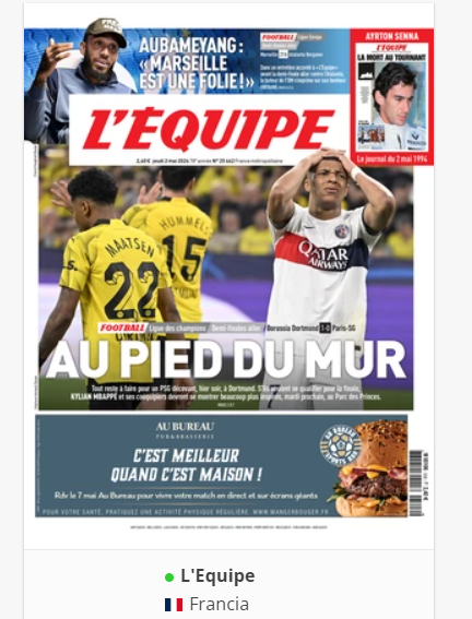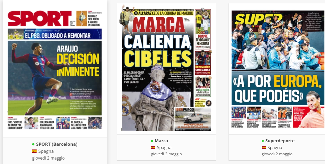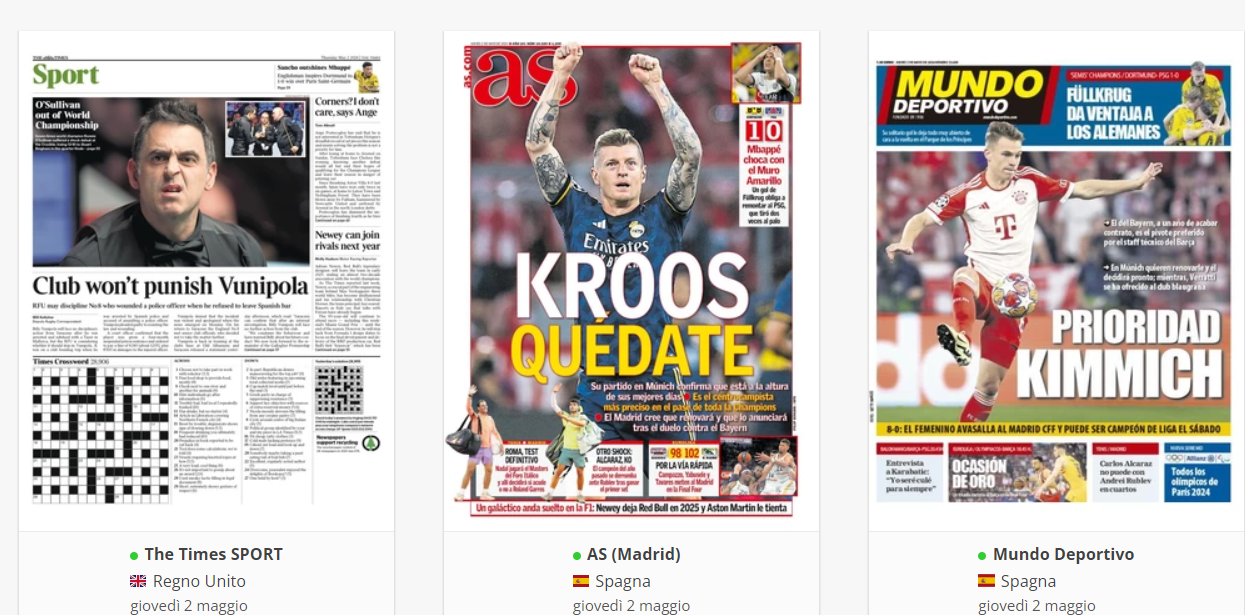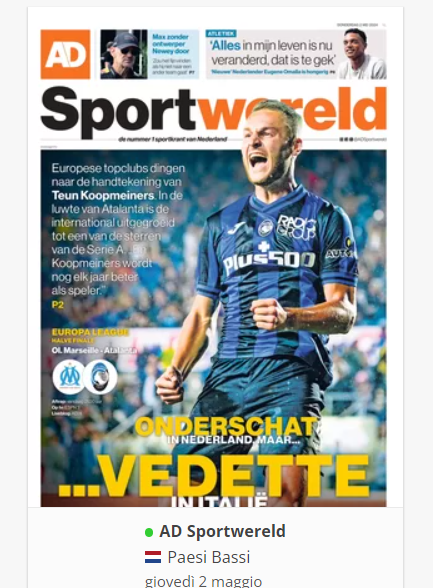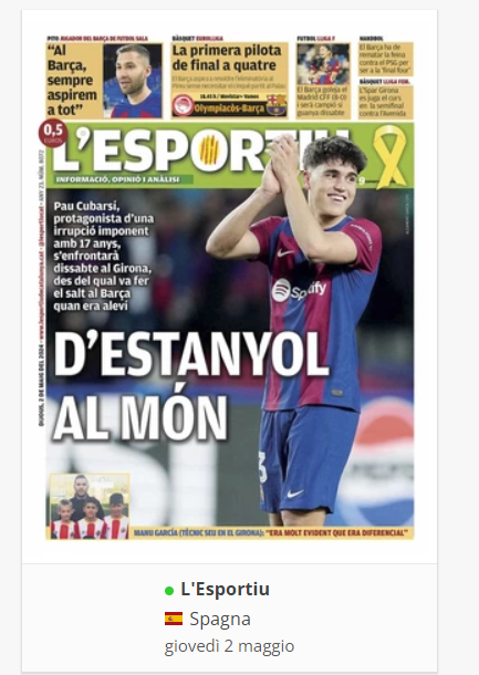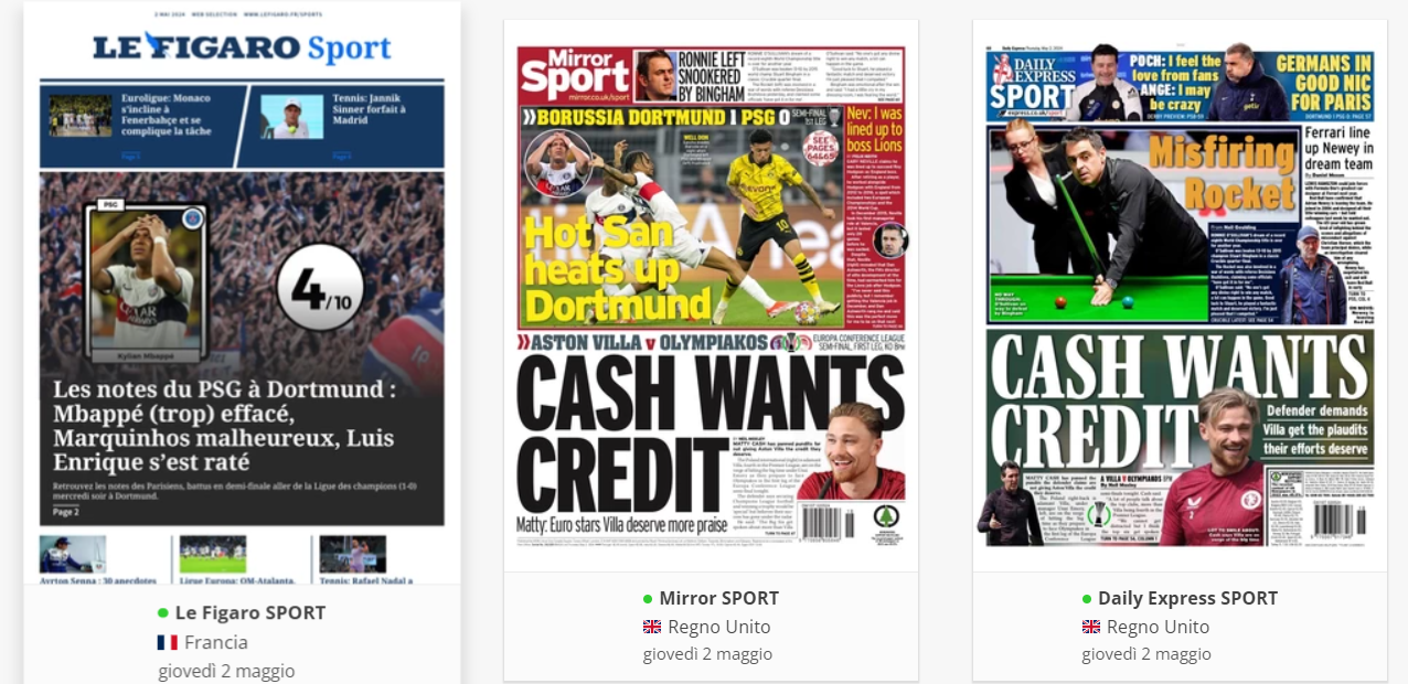NewsCalcioIn Evidenza “RASSEGNA STAMPA INTERNAZIONALE”. Le prime pagine del 2 maggio By Giuseppe Sacco il Mag 2, 2024 - 07:00:11 0 Condividi In primo piano sui principali quotidiani sportivi internazionali Factory della Comunicazione CalcioNapoliRassegnaStampa 0 Condividi FacebookTwitterGoogle+ReddItWhatsAppPinterestE-mail