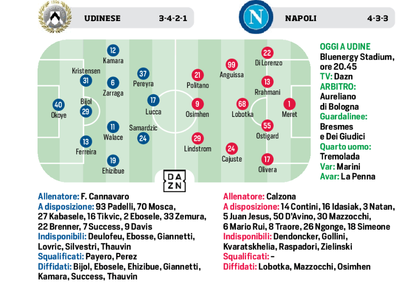 A conti fatti, insomma, Calzona dovrebbe optare per il classico 4-3-3 con Meret in porta; una linea a quattro composta da Di Lorenzo, Rrahmani, Ostigard e Olivera; un tris di centrocampo Anguissa, Lobotka, Cajuste; e il tridente Politano-Osimhen-Lindstrom. Attacco inedito, completamente, mai schierato così sin dall’inizio della stagione. Magari funziona. Di positivo, volendo, c’è a coté la tradizione positiva di Osi contro l’Udinese: è andato a segno in ciascuna delle ultime cinque partite contro i bianconeri (6 gol in totale).