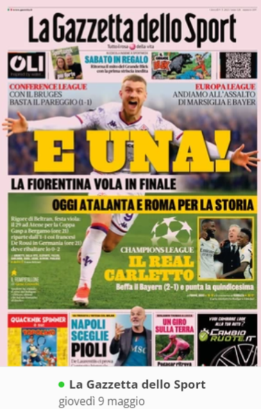 NewsCalcioRassegna Stampa “PRIME PAGINE SPORTIVE”. La rassegna stampa del 9 maggio By Giuseppe Sacco il Mag 9, 2024 - 08:00:18 0 Condividi In primo piano sui principali quotidiani sportivi nazionali Factory della Comunicazione CalcioNapoliRassegnaStampa 0 Condividi FacebookTwitterGoogle+ReddItWhatsAppPinterestE-mail