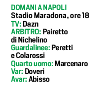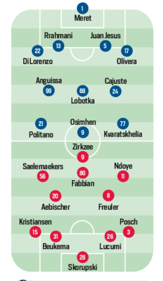 Calzona per il suo 4-3-3 si affiderà a Meret in porta, a coprirlo ci saranno Di Lorenzo, Rrahmani, Juan Jesus che torna titolare e Olivera in vantaggio su Mario Rui. Il centrocampo sarà formato da Anguissa, Lobotka e Cajuste ancora una volta favorito a Traorè. In attacco accanto a Politano e Osimhen ci sarà il ritorno di Kvaratskhelia che dovrebbe partire regolarmente dal primo minuto vincendo il ballottaggio con Lindstrom.