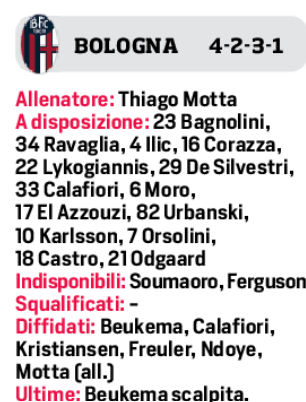Thiago Motta nel suo 4-1-4-1 si affiderà a Skorupski in porta. La difesa sarà formata da Posch, Lucumì, Calafiori e Kristiansen, a centrocampo ci sarà Freuler alle spalle di Aebischer, El Azzouzi, Saelemaekers e Orsolini. Unica punta Zirkzee.