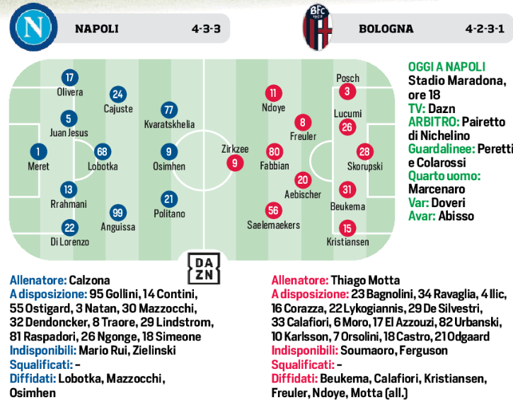 Thiago Motta ha scelto gli undici che questo pomeriggio affronteranno il Napoli allo stadio Maradona, pensando soprattutto al fattore tecnico, ma anche con uno sguardo ai tanti giocatori in diffida. Cerchiamo di capire chi sono. Skorupski parte in vantaggio su Ravaglia, anche per le ottime prestazioni delle ultime settimane, mentre non dovrebbero esserci dubbi sull’utilizzo di Posch a destra, così come Kristiansen parte in vantaggio su Lykogiannis a sinistra. La prima scelta è legata ai centrali. Beukema dovrebbe essere preferito a Calafiori (entrambi in diffida), mentre la certezza è Lucumi, il cui rendimento è alto e costante. Giocherà con la spada di Damocle della diffida anche Freuler, ma per lui un posto Motta lo trova sempre, essendo il faro del centrocampo e una sorta di allenatore in campo. Mai saltata una gara, da titolare o subentrato, eccetto un incontro per squalifica, Aebischer, che affiancherà il compagno di nazionale, mentre nel ruolo di raccordo con il reparto avanzato dovrebbe averla spuntata Fabbian su Moro ed El Azzouzi. Ballottaggio aperto fino all’ultimo a destra tra Ndoye, il favorito, e Orsolini, mentre a sinistra Saelemaekers vorrà confermare l’elezione a calciatore del mese di aprile votato dall’AIC, con Zirkzee centravanti.