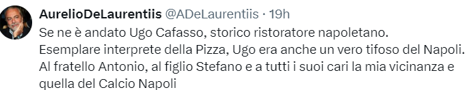 Anche Aurelio De Laurentiis ha voluto salutare e ricordare Ugo Cafasso, scomparso due giorni fa alla soglia degli 80 anni, tra i decani dell’arte della pizza in città.Nelle ultime ore tanti sono stati i saluti allo storico pizzaiolo napoletano, amato da tutti tra clienti e colleghi, frequentatori della pizzeria Capasso a Porta San Gennaro.
