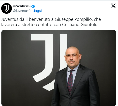 «La Juventus dà il benvenuto a Giuseppe Pompilio, che lavorerà a stretto contatto con Cristiano Giuntoli».