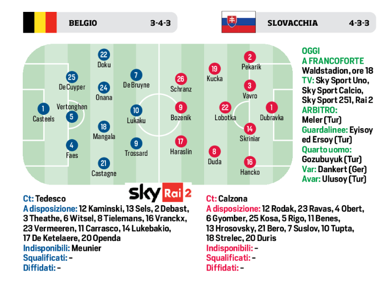 Europei 2024 – Ore 18,00 Belgio / Slovacchia – Sfida italiana tra Lukaku e Lobotka con i tecnici Tedesco e Calzona