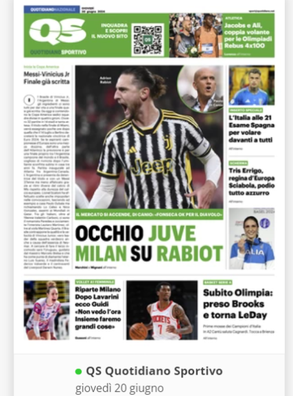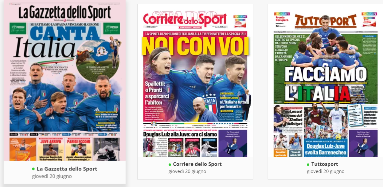 NewsCalcioIn Evidenza “RASSEGNA STAMPA” – Le prime pagine sportive nazionali By Giuseppe Sacco il Giu 20, 2024 - 07:00:42 0 Condividi In primo piano sui principali quotidiani sportivi nazionali Factory della Comunicazione CalcioNapoliRassegnaStampa 0 Condividi FacebookTwitterGoogle+ReddItWhatsAppPinterestE-mail