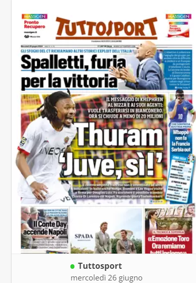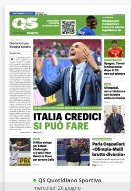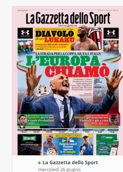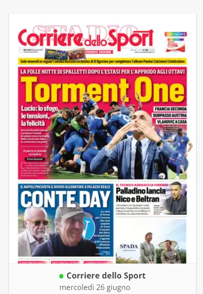 NewsCalcioIn Evidenza “RASSEGNA STAMPA” – Le prime pagine sportive del 26 giugno By Giuseppe Sacco il Giu 26, 2024 - 07:00:21 0 Condividi In primo piano sui principali quotidiani sportivi nazionali Factory della Comunicazione CalcioNapoliRassegnaStampa 0 Condividi FacebookTwitterGoogle+ReddItWhatsAppPinterestE-mail