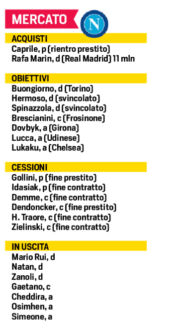 Due acquisti, gli obiettivi sono sette. Cessioni già effettuate, sei. Il mercato in uscita è di 7 elementi. In pratica quella riportata nella foto la “situazione” in casa Napoli. Fermo restando le questioni interne da risolvere, da Di Lorenzo a Kvara e il rientro dai prestiti di alcuni calciatori, da “bloccare”, Folorunsho, per esempio…