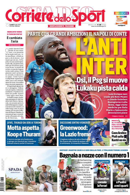 “ANTI INTER” – Cds Campania ‘Parte con grandi ambizioni il Napoli di Conte’. Lukaku pista calda