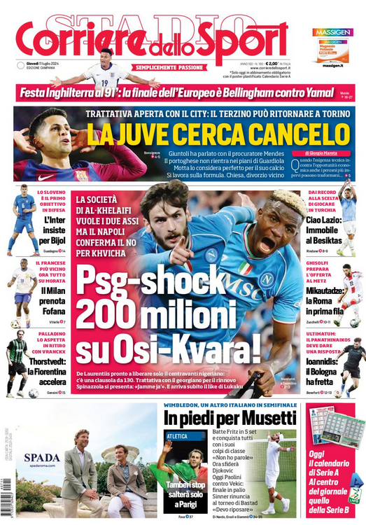 entrambi, i gemelli non vanno separati, ma il fatto è che il 77 non è tra i numeri concessi dal croupier e Kvara non è in vendita. Incedibile, come ha ribadito Antonio Conte nel giorno della sua presentazione anche un po’ stufo. Rien ne va plus. Con Osi, invece, il gioco è possibile. Un affare slegato: lui è vicino ma lontano, è già con la squadra da un paio di giorni e oggi partirà per il ritiro di Dimaro, però il suo futuro è decisamente in sospeso e il Napoli è aperto ad ascoltare anche le offerte vicine al valore della clausola rescissoria inserita nel suo contratto. Totale: 130 milioni di euro. Un parametro che, coniugato con l’ingaggio da circa 10 milioni fino al 2026, ha spaventato gli amanti di questo centravanti straripante, gol e social, fuoco e fiamme. Un uomo in grado di cambiare la squadra e le partite che al tramonto della quarta stagione ha cominciato ad avvertire il bisogno di cambiare pure aria. Conte, del resto, è stato molto chiaro: Victor è un giocatore super, altroché, ma esistono accordi precedenti al suo arrivo e dunque non si può fare altro che guardare e aspettare. In un solo concetto: Osi non è stato inserito per forza di cose nella lista degli intoccabili. Ma Kvara sì. E i gemelli sono a serio rischio separazione.