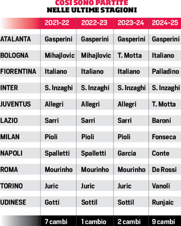 DA PIOLI A FONSECA. Sul nuovo allenatore del Milan si gioca molto Ibrahimovic che l’ha scelto. Pioli aveva vinto uno scudetto quando nessuno poteva immaginarlo, Fonseca torna in Italia dopo due buone stagioni col Lilla successivo al biennio (non completo) con la Roma. Ha tanto da dimostrare in una squadra che si sta rinnovando (e potenziando) e che l’anno scorso ha chiuso al secondo posto. DA ALLEGRI A THIAGO MOTTA. È il cambiamento che ha fatto più rumore. Allegri ha chiuso la sua seconda avventura bianconera col licenziamento e ora Thiago Motta, che ha portato il Bologna in Champions, avrà una grande responsabilità: restituire alla Juventus la vecchia nobiltà. C’è una forte curiosità intorno all’arrivo dell’italo-brasiliano perché nella sua giovane carriera non ha mai allenato una squadra impegnata sia in campionato che in una coppa europea. Dovrà trasmettere una nuova identità tattica e, al tempo stesso, gestire le risorse. DA Thiago MOTTA A ITALIANO. Su certi concetti, tipo il gioco forte sulle ali, precedessore e successore si somigliano. Ma se Thiago passa da una squadra che gioca due gare ogni settimana a una che ne farà tre, Italiano arriva a Bologna con una solida esperienza in campo europeo. Certo, la Conference League frequentata dalla Fiorentina (è arrivata due volte di fila in finale) non è la Champions, ma con i viola il nuovo tecnico rossoblù è riuscito a giocare anche 60 partite a stagione. Pure sotto questo profilo è una garanzia.