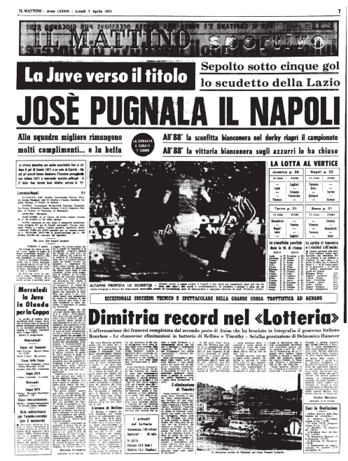 Giocavano, incantavano, vincevano. Non era più il calcio all’italiana da contropiede, era un Napoli all’olandese che, dando spettacolo, arrivò a due punti dalla vetta. Maledetto aprile 1975 e maledetta, solita, Juve. «Di Juve come di mamma ce n’è una sola…E mamma Juventus, a braccetto con Altafini, l’attempato ex idolo del Napoli, se n’è andata con la vittoria» scriveva in prima pagina l’altro inviato del «Mattino» Franco Grassi. Già, Altafini, il collezionista di pipe, l’attaccante che soprannominavano «coniglio» perché non rischiava mai le gambe. Un brasiliano che, in coppia con Sivori, aveva dato spettacolo a Napoli pochi anni prima. Svincolato a 34 anni, era diventato un lusso per Ferlaino che non se la sentiva di pagargli un milione di lire per ogni presenza in campo. E Altafini emigrò a Torino.Due punti separavano il Napoli dalla Juve. Se gli azzurri avessero vinto a Torino, avrebbero affiancato i bianconeri in vetta. Tutto in una partita, e quel giorno i napoletani-meridionali, molti emigrati, erano non meno di tredicimila sugli spalti del Comunale. Tre inviati, quattro pagine sulla partita, un collaboratore dal nord, Gino Bacci, a raccogliere le interviste bianconere: «Il Mattino», diretto da Giacomo Ghirardo, preparò tutto alla perfezione per seguire quell’evento della storia azzurra. La cronaca della partita, pagelle comprese, era compito di Romoletto Acampora, futuro responsabile dello Sport. Da brividi i nomi della formazione bianconera, con nomi come Zoff, Gentile, Scirea, Causio, Capello, Bettega. Ma il Napoli se la giocò e, passato in svantaggio con un gol di Causio per un’unica disattenzione di Pogliana, rimontò con il capitano Antonio Juliano e poi fu sempre lì a minacciare la porta juventina. Il centrocampo parlava napoletano anche per fede di nascita, con Juliano, Peppeniello Massa ex Internapoli, Salvatore Esposito di Torre Annunziata. Poi, i due estemporanei in attacco: il brasiliano «el Gringo» Sergio Clerici e l’irruento Giorgio Braglia. Parità fino a due minuti dalla fine, poi la mischia fatale e Altafini in gol.«Core ‘ngrato» fu subito, quella sera, il manifesto comparso in Galleria su Altafini e ne diede già conto «Il Mattino» in quel numero del lunedì. Romoletto fu generoso nelle pagelle: 8 a Burgnich, La Palma e Andrea Orlandini; 9 al capitano Juliano trascinatore a centrocampo, rigenerato da Vinicio che ne aveva fatto il faro della squadra. Cinque partite alla fine, ma con la Juve che allungava di 4 punti dopo quella vittoria. Il sogno scudetto sfumava, eppure Romoletto Acampora, orgoglioso, scrisse: «Torniamo a casa, fratelli. Siamo più forti, anche se il risultato e la classifica affermano il contrario».