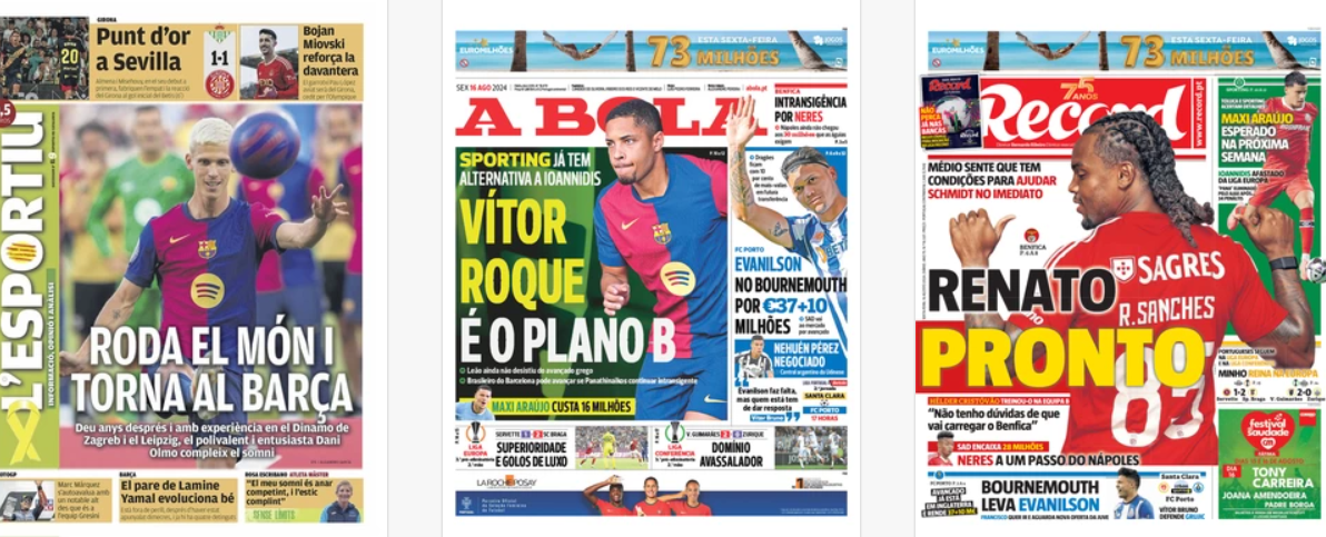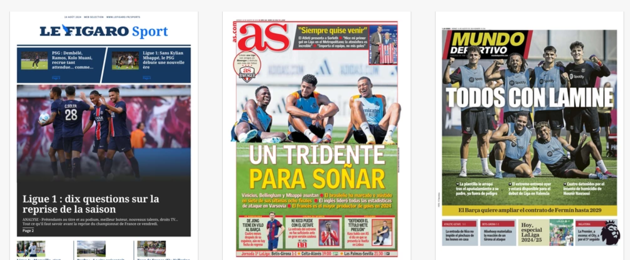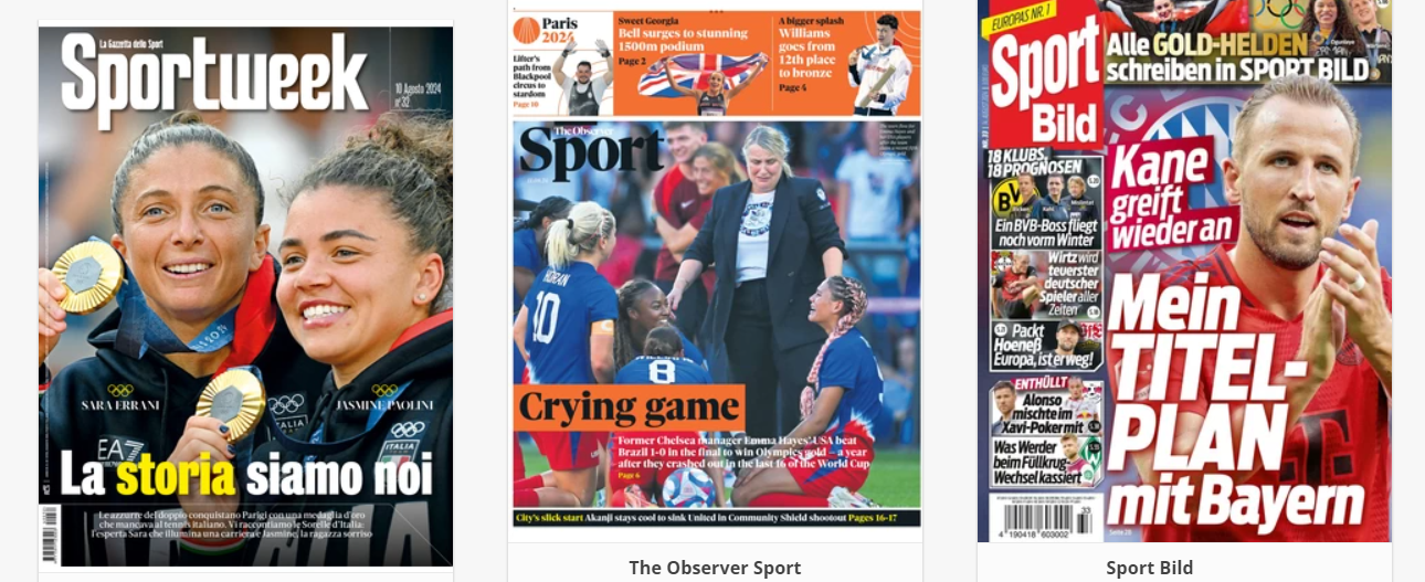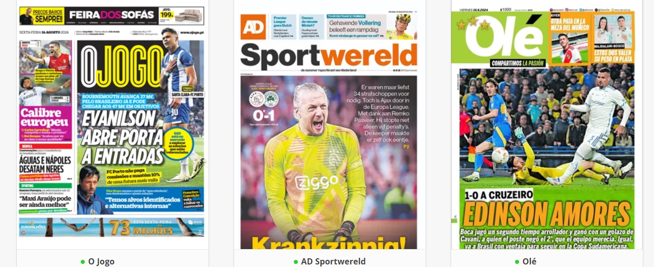 NewsCalcioRassegna Stampa “RASSEGNA STAMPA INTERNAZIONALE” – Le prime pagine sportive del mondo By Giuseppe Sacco il Ago 16, 2024 - 08:00:05 0 Condividi In primo piano sui principali quotidiani sportivi nel mondo Factory della Comunicazione CalcioPagineprimeRassegna 0 Condividi FacebookTwitterGoogle+ReddItWhatsAppPinterestE-mail