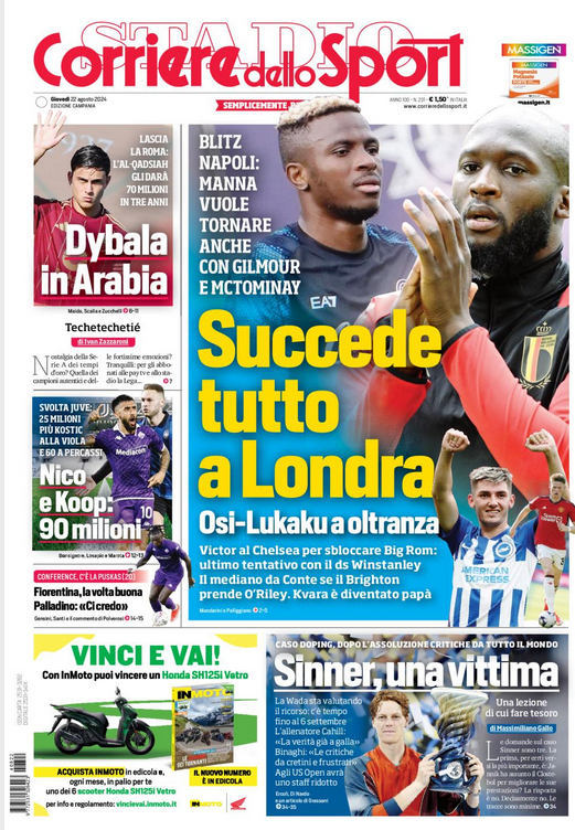 l’acquisto di Billy Gilmour con il Brighton, per continuare a tessere la complicatissima trama del romanzo di Scott McTominay con il Manchester United e soprattutto per venire fuori dall’incubo Lukaku-Osimhen, il grande equivoco del mercato del Napoli e il grandissimo impedimento al decollo del progetto di Antonio Conte. A vuoto la prima missione, andata in scena mentre a Roma sfilava Brescianini sul palcoscenico delle visite mediche con vista sull’A1 e sull’A4, direzione Bergamo-Dea; piena di speranze quella cominciata quando Conte era già un’ora nel futuro del suo direttore sportivo (orario italiano). Anche perché senza margini di successo e concreti segnali dal Brighton and friends, non avrebbe avuto molto senso tornare in Inghilterra per la seconda volta in pochi giorni: evidentemente, Manna sa il fatto suo. Fonte: CdS