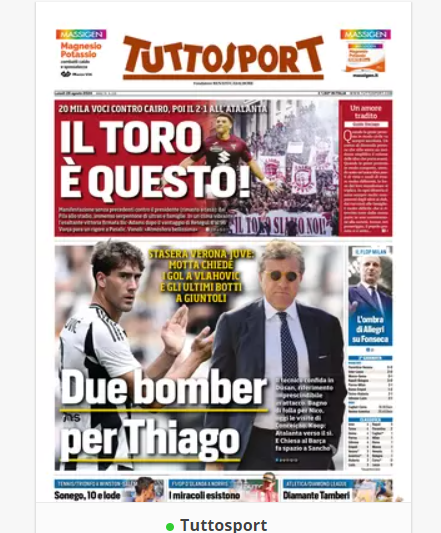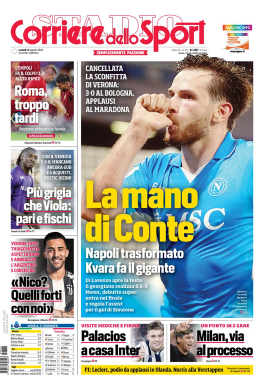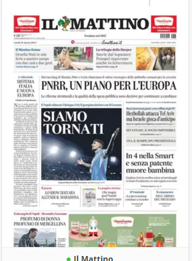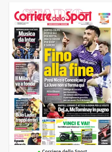 NewsCalcioIn Evidenza “RASSEGNA STAMPA” – Prime pagine sportive nazionali del 26 agosto By Giuseppe Sacco il Ago 26, 2024 - 07:00:01 0 Condividi In primo piano sui principali quotidiani sportivi nazionali Factory della Comunicazione 0 Condividi FacebookTwitterGoogle+ReddItWhatsAppPinterestE-mail