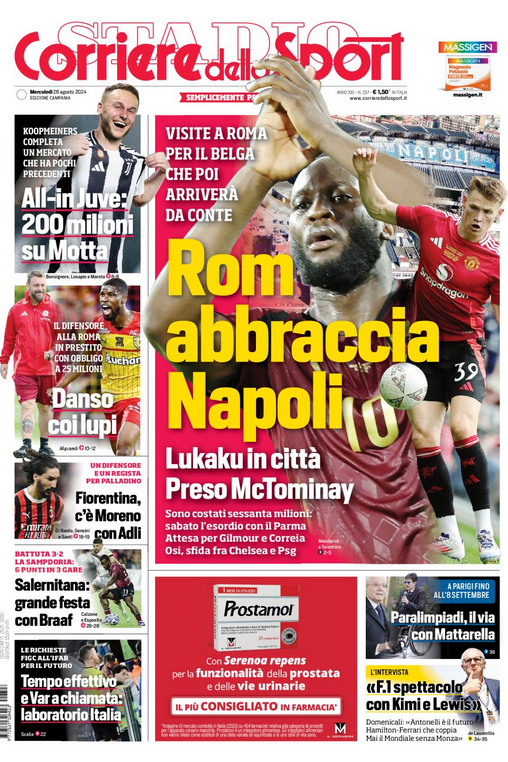 Il primo ad arrivare a Napoli sarà Rom: oggi partirà da Bruxelles per Roma a bordo di un volo privato e poi, di buon mattino, raggiungerà Villa Stuart per sottoporsi alle visite mediche. Per lui sarà un ritorno, un grande ma fugace ritorno nella città che un anno fa lo ha ammirato e applaudito da centravanti della Roma. Il placet per mettere in moto il meccanismo trasferimento-visite è arrivato ieri: risolti gli aspetti (ostacoli) legati ai diritti d’immagine, il club azzurro ha definito tutti gli altri passaggi burocratici con il Chelsea e i Blues hanno autorizzato i test. A seguire andrà di corsa a Napoli e magari passerà anche a Castel Volturno per l’allenamento del pomeriggio, se i tempi coincideranno: ritroverà Conte, il suo allenatore totem, l’uomo con cui ha reso come con nessun altro in carriera, a distanza di tre anni dal biennio di gol e successi all’Inter. Firmerà un contratto triennale, fino al 2027, a 6 milioni a stagione più bonus (con i benefici del Decreto Crescita).