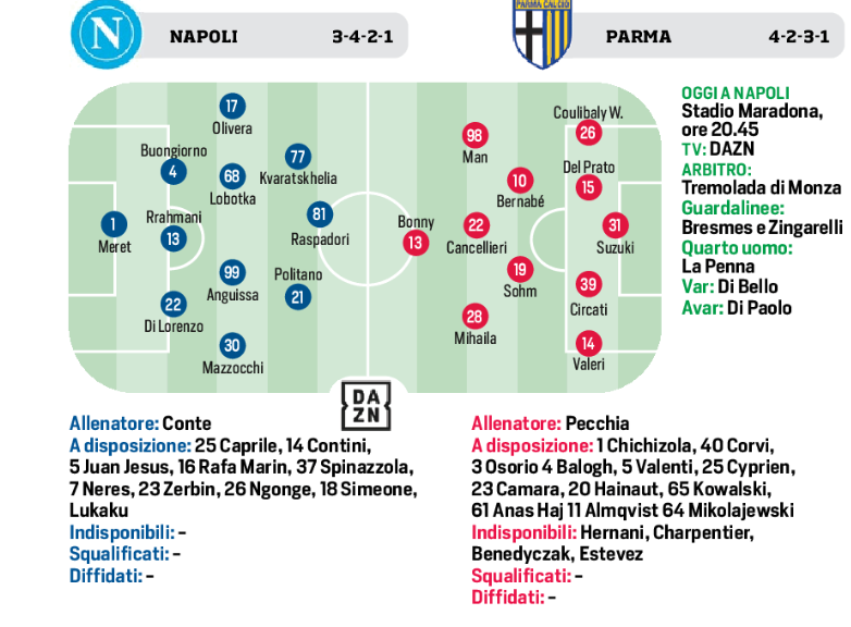 Ci sarà tempo per vedere la squadra cambiare gradualmente pelle. Quella che scenderà in campo questa sera al Maradona contro il Parma di Pecchia ricorderà molto, o forse del tutto, quella che domenica scorsa ha battuto il Bologna per 3-0. Conte potrebbe confermare in blocco l’undici protagonista della prima vittoria in campionato. Resiste qualche dubbio ma nel complesso le idee sono chiare così come le indicazioni avute durante la settimana. .