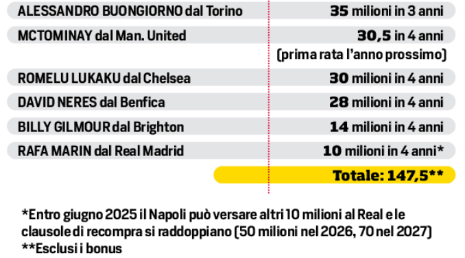 l colpo più ricco è stato Buongiorno dal Torino: 35 milioni più 3 di bonus. Poi, 30,5 milioni per McT; 30 al Chelsea per Lukaku; 28 al Benfica più 2 di bonus per Neres; 14 al Brighton per Gilmour; 10 al Real Madrid per Rafa Marin. Di contro, ceduti Ostigard e Gaetano per 7 e 6 milioni a Rennes e Cagliari; mentre Lindstrom, Zanoli, Natan, Cajuste, Cheddira, Iaccarino, Coli Saco e Mezzoni sono stati trasferiti tutti in prestito secco, con diritto oppure obbligo di riscatto. Ovvero: molti sono incassi ipotetici (Lindstrom, ad esempio, potrebbe fruttare 22 milioni se l’Everton lo riscatterà).