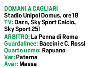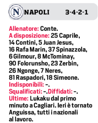 LE SCELTE. Conte ha ancora a disposizione l’allenamento di oggi prima di battezzare definitivamente gli undici uomini che dovranno sfidare il Cagliari dall’inizio, ma la certezza di fondo è che domani comincerà ancora con il 3-4-2-1. Sistema consolidato nel corso dell’estate con Meret in porta; una difesa a tre con Di Lorenzo, Rrahmani e Buongiorno; la linea a quattro di mediana formata da Mazzocchi, Anguissa, Lobotka e Olivera; Politano e Kvaratskhelia alle spalle di Lukaku in attacco.