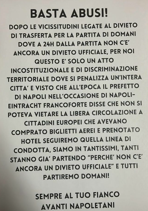 IL COMUNICATO. Il Napoli ufficializza la storia prima delle 16 attraverso i social del club: «La SSC Napoli informa che, relativamente al match Juventus-Napoli, il Prefetto di Torino ha decretato: il divieto di vendita dei tagliandi ai residenti nella provincia di Napoli, anche se in possesso della fidelity card della SSC Napoli, ad esclusione dei possessori della fidelity card della Juventus F.C. emessa in data anteriore al 21 settembre 2024 e contestualmente l’annullamento dei biglietti già venduti. La vendita dei tagliandi per la Tribuna Ospiti ai soli possessori della fidelity card della SSC Napoli, ovunque residenti tranne che nella provincia di Napoli». Più un elenco di restrizioni a coté a fare scopa con la decisione.