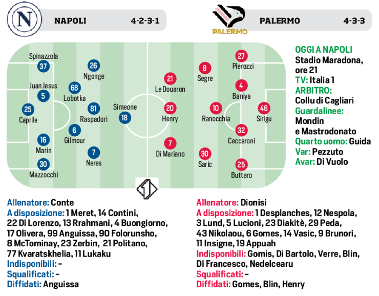(Grafico) Coppa Italia: Napoli/Palermo, così li mette in campo il CorrSport