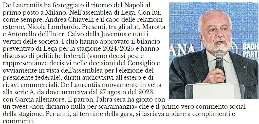 Il presidente De Laurentiis ha festeggiato il primato ritrovato dal Napoli dopo oltre un anno nell’assemblea di Lega a Milano, dove i rappresentanti dei club di Serie A hanno affrontato diverse tematiche.