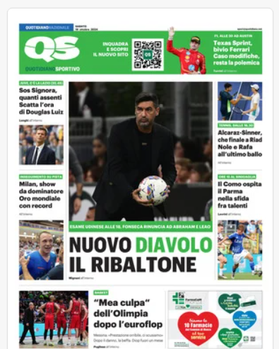 NewsCalcioIn Evidenza ⚽️RASSEGNA STAMPA⚽️ “Prime pagine sportive del 19 ottobre” By Giuseppe Sacco il Ott 19, 2024 - 07:00:10 0 Condividi In primo piano sui principali quotidiani sportivi nazionali Factory della Comunicazione CalcioNapoliRassegnaStampa 0 Condividi FacebookTwitterGoogle+ReddItWhatsAppPinterestE-mail
