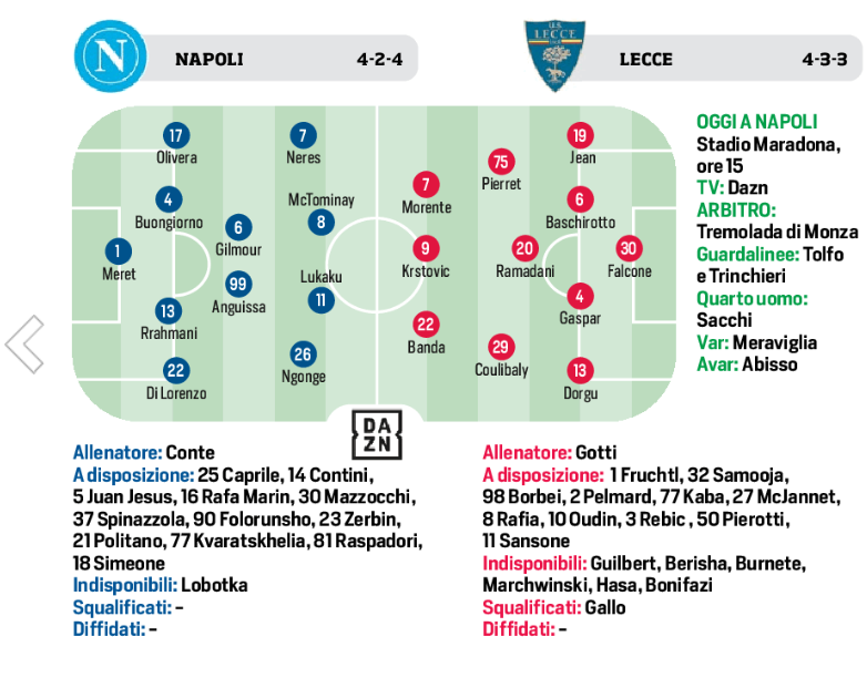 Conte opta per una serie di sostituzioni orientando lo sguardo alla sfida con il Lecce e alla trasferta di martedì a San Siro contro il Milan. La novità, cioè le novità di certo più interessanti andranno in scena in attacco: tridente nuovo di zecca, completamente inedito e tutto mancino con Ngonge a destra, Lukaku a recitare da centravanti e Neres a sinistra. Per Cyril il belga – come Rom – e David il brasiliano sarà l’esordio in campionato dall’inizio: l’unica da titolari, finora, l’hanno giocata in Coppa Italia contro il Palermo, lasciando entrambi i l segno sottoforma di go l e assist. Per quel che riguarda il resto, Meret sarà convocato e soprattutto riprenderà le chiavi della porta dopo le tre giornate di assenza con Monza, Como ed Empoli a causa dell’infortunio muscolare rimediato con la Juventus a Torino (Caprile in panchina); e Olivera prenderà il posto di Spinazzola a sinistra rispetto alla formazione che sei giorni fa ha cominciato la partita al Castellani.