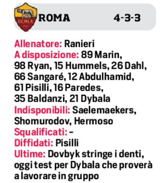 Ha studiato a lungo anche la strategia per il suo terzo esordio, avendo compreso in fretta che non avrebbe potuto contare su Dybala a tempo pieno. E allora la strada tracciata, da un punto di vista tattico, sembra definita: difesa a quattro, blocco basso ma non schiacciato, due linee laterali coperte per contenere le sovrapposizioni del Napoli, inserimenti dei centrocampisti per valorizzare Dovbyk davanti. Potrebbe non bastare per ottenere un risultato positivo ma è probabilmente l’unica opzione che Ranieri scorge all’orizzonte, dal finestrino del suo Frecciarossa arrivato a Napoli ieri pomeriggio. La Roma di Juric, un bravo tecnico calato in una realtà ingovernabile, ha incassato 11 gol nelle ultime 4 partite, quasi 3 per volta in media. Il primo punto all’ordine del giorno dell’assemblea di condominio, a Trigoria, era discutere il metodo per proteggere Svilar.