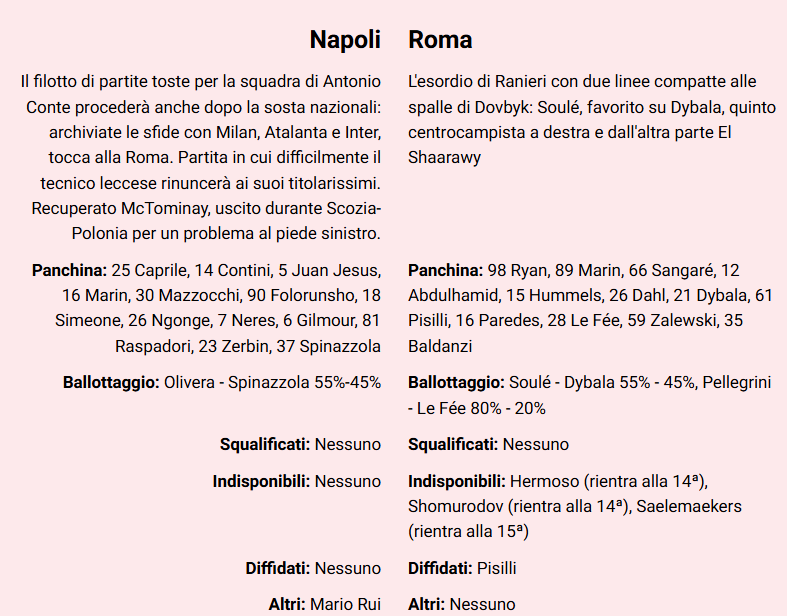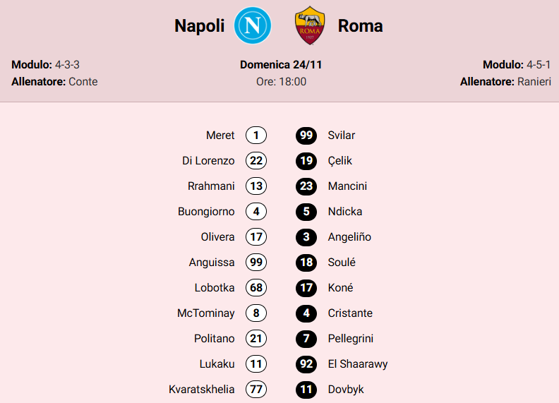 Attesa per oggi alle 18.00 al Maradona. Per il derby del sole in campo il Napoli di Antonio Conte e la prima “nuova” Roma di Claudio Ranieri. La Gazzetta dello Sport, con una serie di dati e curiosità, mette in campo i 22 “prescelti” e analizza il match attraverso una serie di dati: