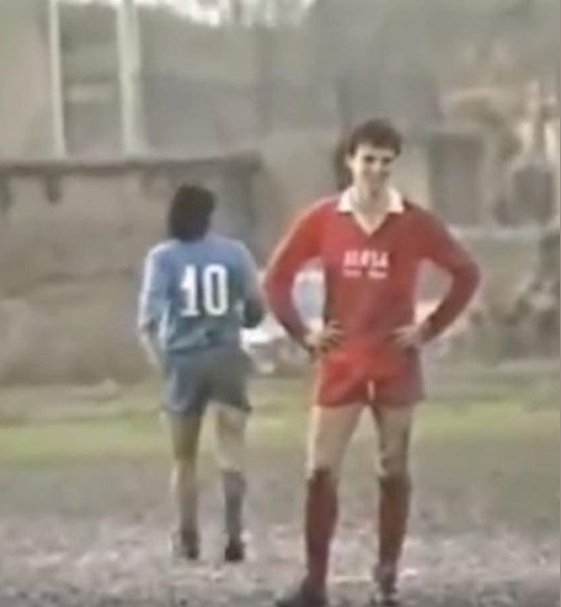 Niente foto singole …l’organizzazione non ce lo consente …. solo una collettiva a centrocampo prima dell’inizio della partita; ok …ma non mi faccio fare fesso… lotto, quasi sgomito con i miei compagni di squadra e riesco a collocarni alle Tue spalle… ecco sei accovacciato ed io sono in piedi dietro di Te appoggiando una mano sulla tua spalla….. Dai fotografo muoviti e soprattutto non la fare sfocata … Fatta !! Ed il mio Cuore continua a battere forte …ma non mi svegliate vi prego: sono qui su un campo con il mio D10S !!!!