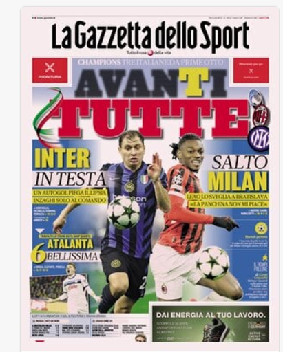 NewsCalcioIn Evidenza ⚽️”RASSEGNA STAMPA”⚽️ – Le prime pagine sportive del 27 novembre By Giuseppe Sacco il Nov 27, 2024 - 07:00:23 0 Condividi In primo piano sui principali quotidiani sportivi nazionali Factory della Comunicazione CalcioNapoliRassegnaStampa 0 Condividi FacebookTwitterGoogle+ReddItWhatsAppPinterestE-mail