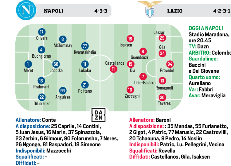 Una partita, che Conte giocherà con la formula praticamente classica. L’ormai consolidato 4-3-3 presentato sin dalla trasferta di San Siro con l’Inter: Meret in porta; Di Lorenzo, Rrahmani, Buongiorno e Olivera nella linea difensiva di partenza; Anguissa, Lobotka e McTominay in mediana; Politano, Lukaku e Kvaratskhelia nel tridente. A seconda dell’atteggiamento della Lazio, ovviamente, cambierà quello degli uomini chiave del Napoli (a cominciare dai compiti di Politano in fase difensiva). Il Maradona sarà pieno anche in questa serata che si annuncia fredda e soprattutto piovosa: nel mirino il quinto sold out di fila.
