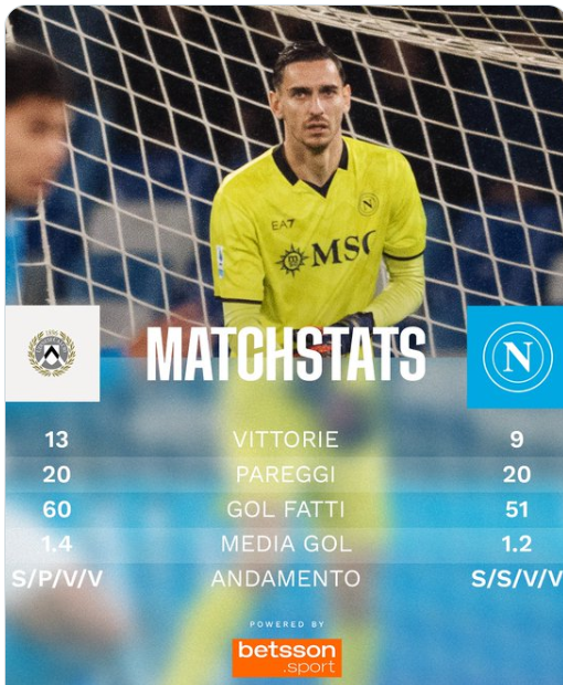Da Udine a Udine, un anno e mezzo dopo. Da un Tricolore atteso 33 anni a un altro che è ancora tutto da conquistare. Il Napoli torna al Bluenergy Stadium dopo aver perso la testa della classifica per provare il contro-sorpasso sull’Atalanta, reduce dalle fatiche di Champions. L’Udinese però ha ritrovato il successo nell’ultimo turno in trasferta contro il Monza e ha fermato il Napoli in 3 degli ultimi 5 incroci giocati in casa, tutti terminati con il punteggio di 1-1. Fonte Gazzetta