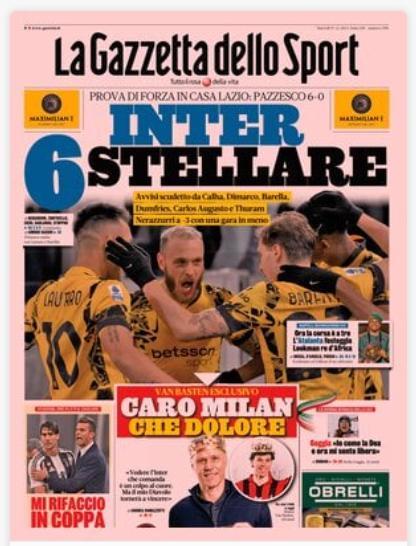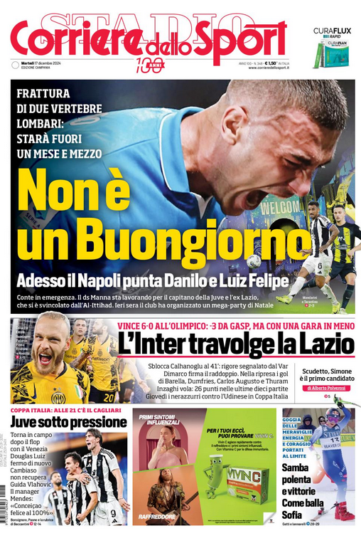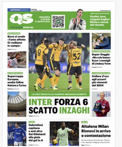 Su X.comCalcioNews ⚽️”RASSEGNA STAMPA”⚽️ – Prime pagine sportive del 17 dicembre By Giuseppe Sacco il Dic 17, 2024 - 07:00:18 0 Condividi IN PRIMO PIANO SUI PRINCIPALI QUOTIDIANI SPORTIVI NAZIONALI Factory della Comunicazione CalcioNapoliPaineprime 0 Condividi FacebookTwitterGoogle+ReddItWhatsAppPinterestE-mail
