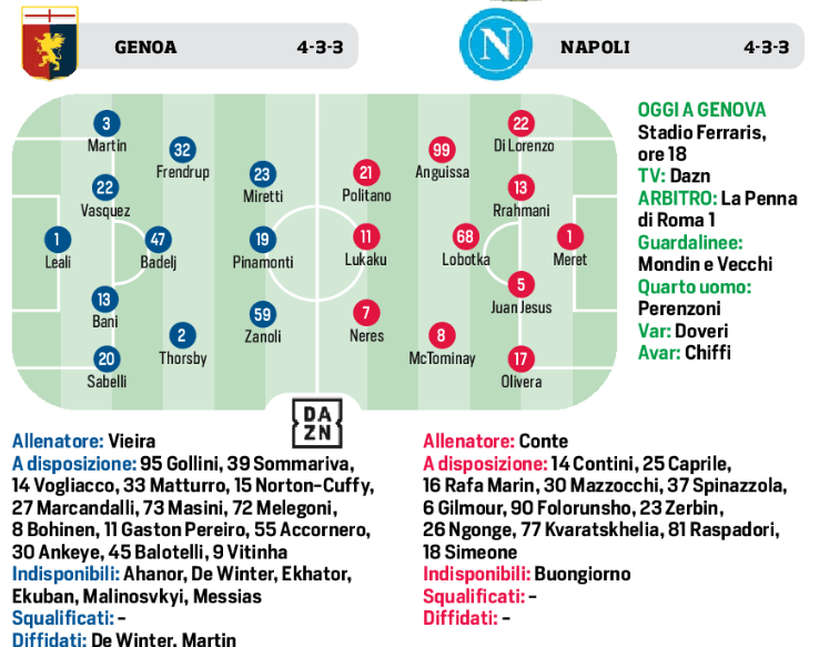 Intanto si scende in campo per la sfida importantissima col Napoli col sogno di sfatare il tabù e vincere la prima casalinga quest’anno al Ferraris. È in serie positiva Vieira da quando è arrivato sulla panchina del Genoa ma adesso cerca il colpaccio che avrebbe un significato importante per la classifica e lo farà col consueto 4-3-3 con Pinamonti affiancato da Zanoli e Miretti