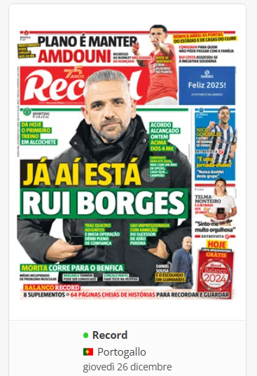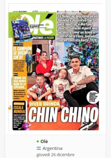 NewsCalcioRassegna Stampa ⚽️RASSEGNA STAMPA ESTERA⚽️ – Prime pagine del 26 dicembre By Giuseppe Sacco il Dic 26, 2024 - 08:30:07 0 Condividi In primo piano sui principali quotidiani esteri Factory della Comunicazione CalcioEsteraNapoliRassegna 0 Condividi FacebookTwitterGoogle+ReddItWhatsAppPinterestE-mail